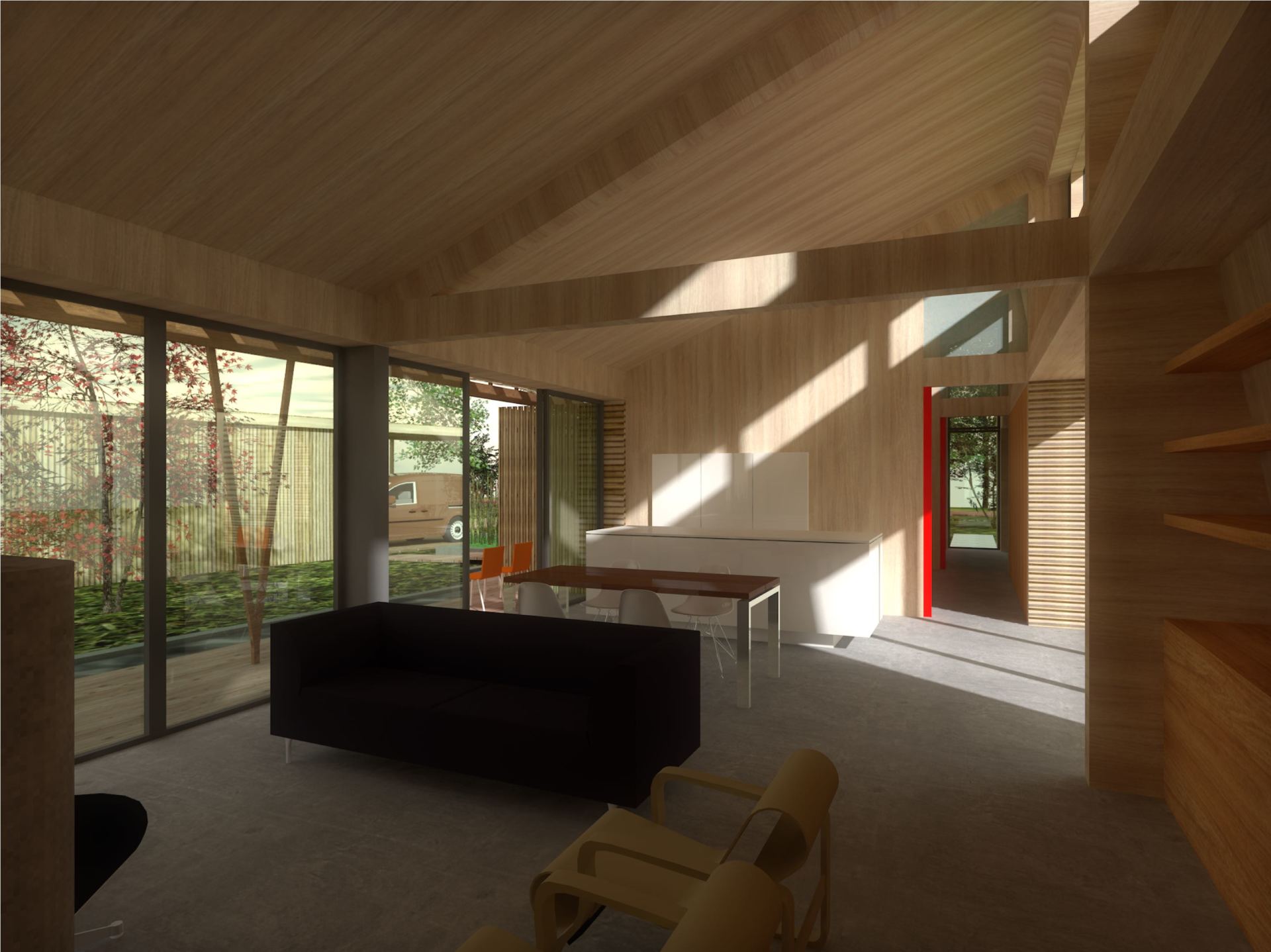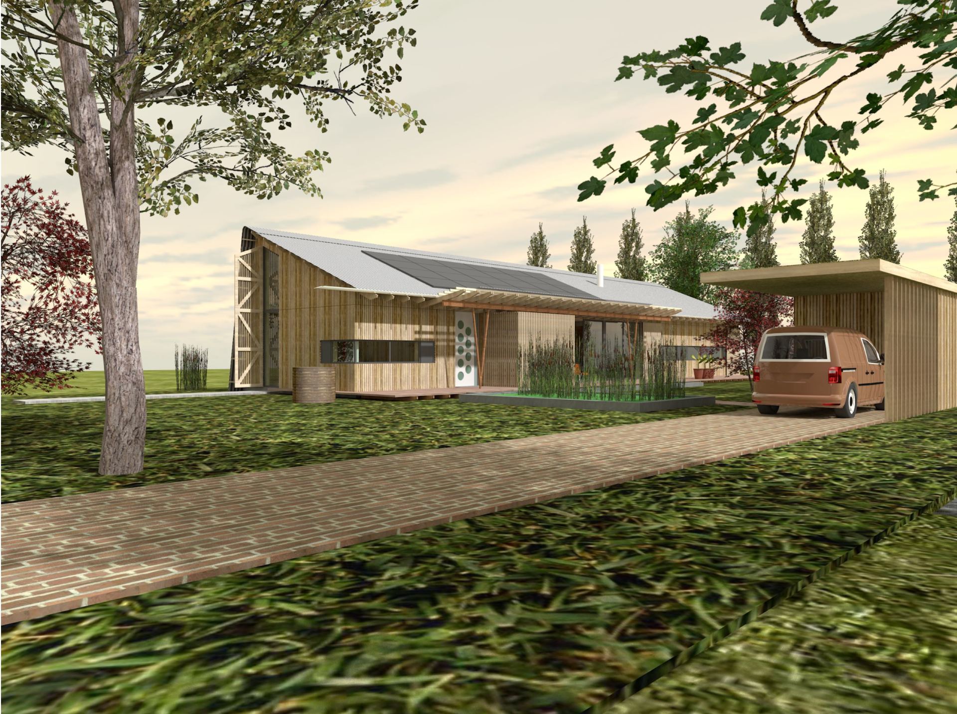 Het huis van MOOST architect is een eigenzinnige duurzame woning die geheel op de begane grond is gesitueerd. Een grote zolder, maar dan op de begane grond. De gevels worden afgewerkt met populieren latten van bomen die uit de polder komen. De binnenafwerking van de wanden en kap is tevens van populier: populieren multiplex (ecoplex). De opbouw is geheel van geprefabriceerde hout-skeletbouw. De isolatie is bio-based en damp-open.