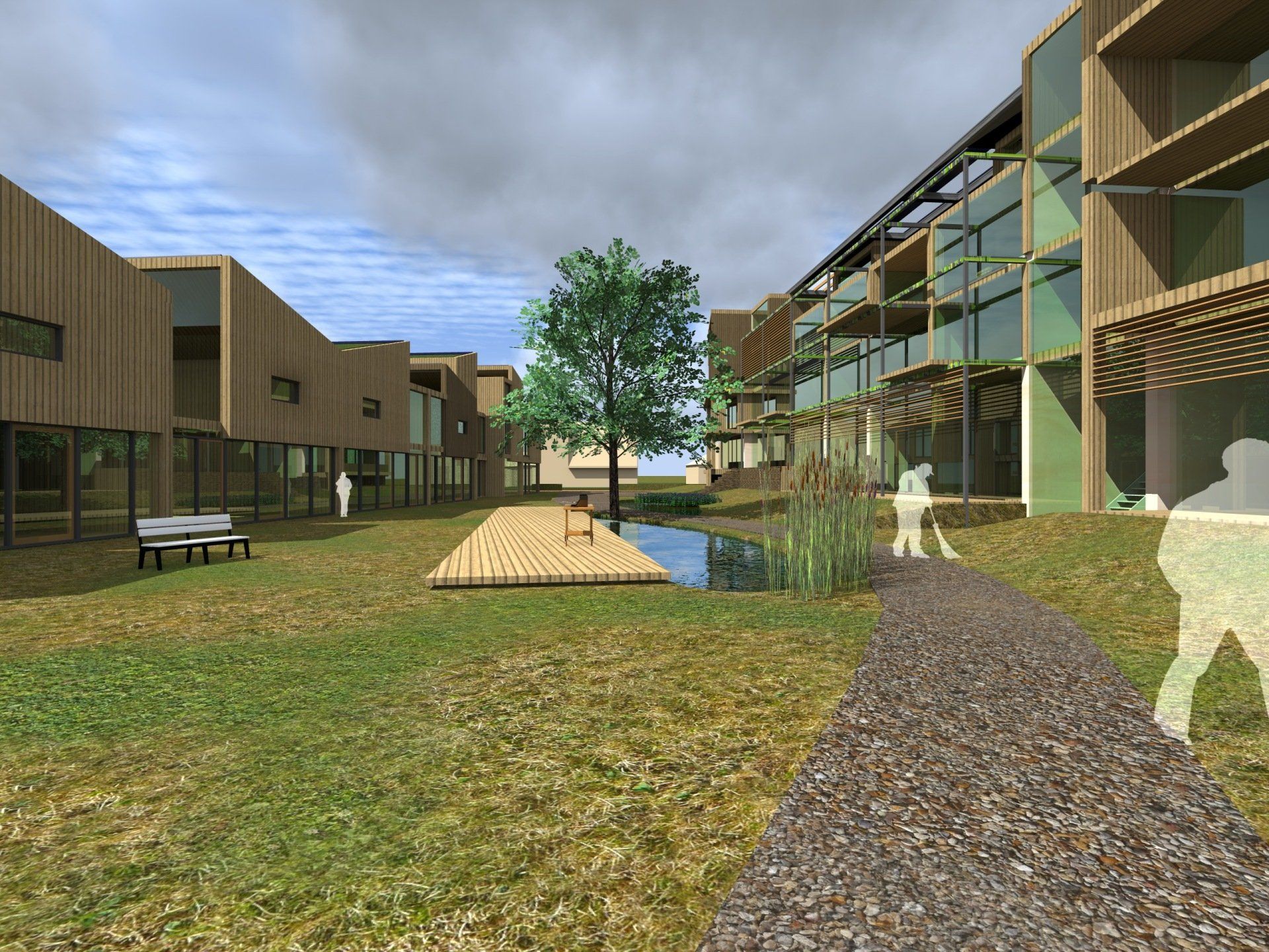 De opzet van de bebouwing is zo gekozen dat de grondgebonden woningen en de appartementen een gezamenlijke binnentuin hebben, die wordt gedeeld. Alle wooneenheden hebben de entree aan de binnentuin, die vrij is van auto’s. Door de lagere grondgebonden woningen aan de zuidkant te realiseren is de binnentuin goed voorzien van zonlicht. De binnentuin wordt gedeeld met alle bewoners. Tevens hebben de grondgebonden woningen een kleine privé-tuin aan de achterzijde van de woning.