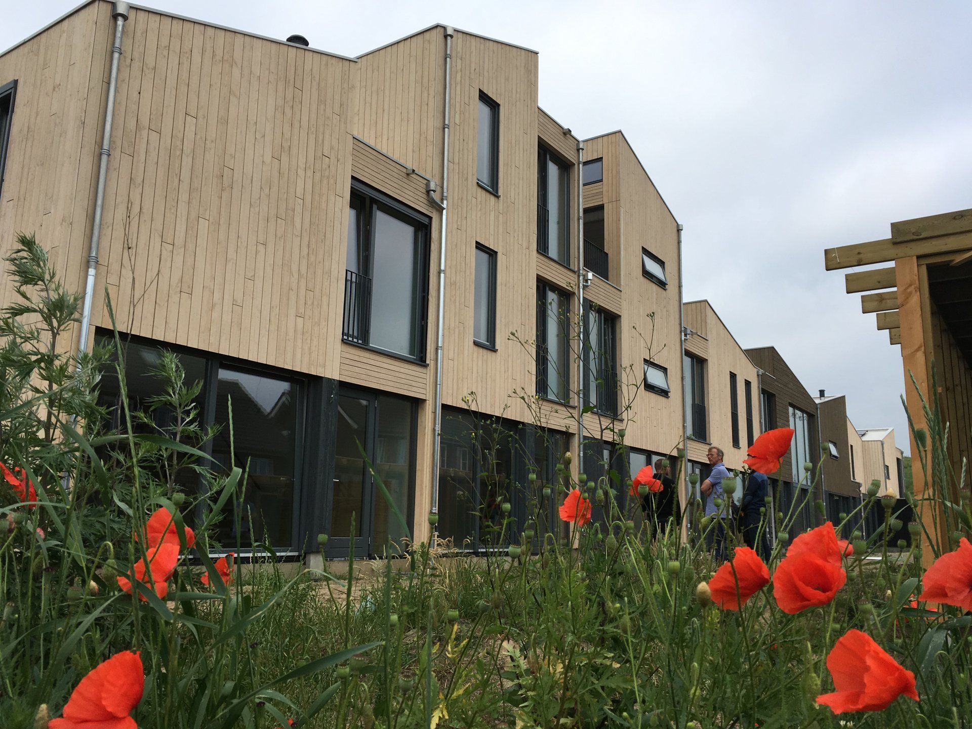 De hoofdstructuur van de woningen is van kalkzandsteen blokken en betonvloeren. Deze zorgen voor goede thermische massa en voldoende geluidsisolatie. De schil van de gebouwen is damp-open en gemaakt in houtskeletbouw elementen met cellulose isolatiemateriaal. De buitenzijde is afgewerkt met open gevel van Douglas houten delen die behandelt zijn met een getinte olie om verkleuring tegen te gaan. De verschillende tinten versterken de gebouwdelen om balans in het geheel te creëren.